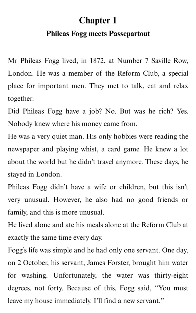 Phileas Fogg is a quiet, rich man who lives a very simple life in London. One day, he makes a surprising bet: he says that he can travel around the world in only eighty days.